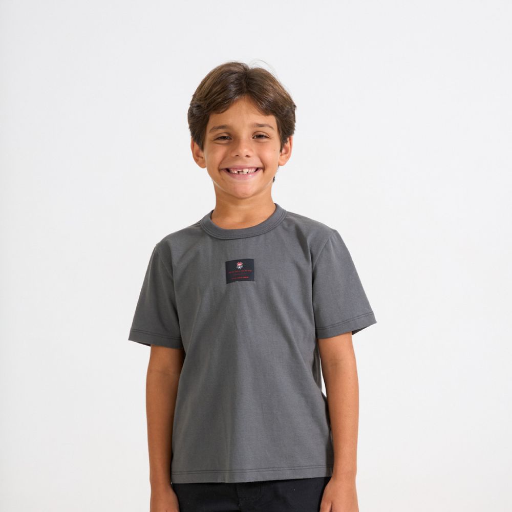 É uma peça básica com um toque especial, trazendo estampa nas costas com o mascote do clube e uma estrofe do hino, celebrando a paixão flamenguista. A etiqueta tecida termocolante centralizada na parte frontal adiciona um detalhe exclusivo. Confeccionada em tecido de fio 30.1 penteado, oferece conforto, durabilidade e maciez, sendo composta por fibra natural de algodão, com baixo risco de causar alergias.