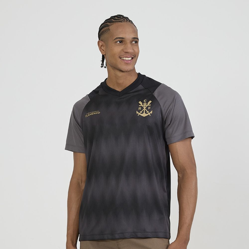 Camiseta raglan em tons de preto e cinza, confeccionada em Dry Max, tecido leve com excelente caimento que garante conforto e alta respirabilidade, mantendo a pele seca. O design traz gola em V, estampa do escudo e assinatura do clube no peito em dourado, destacando-se pela estampa em toque zero inspirada na vibração do canto da torcida, transmitindo toda a emoção e paixão das arquibancadas.