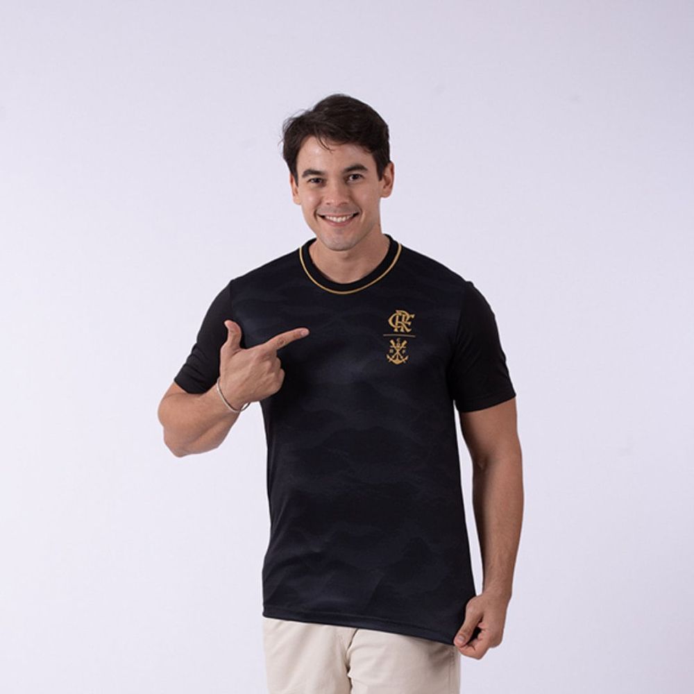 Descubra a camiseta com estampa de toque zero, inspirada na areia da praia. Esta peça exclusiva combina tecidos em um sofisticado mix black and gold, criando um visual elegante e moderno. Adicione um toque de estilo refinado ao seu guarda-roupa com esta camiseta única! Tecido: DRY MAX