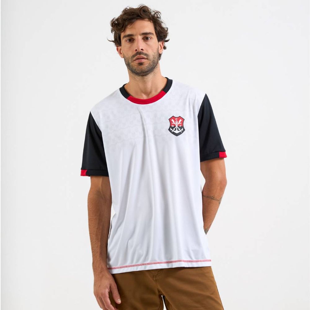 A peça apresenta gola e punhos bipartidos, além de um acabamento em trançado contrastante na barra, agregando um toque diferenciado. Sua estampa inspirada em cestaria reforça a conexão com elementos culturais autênticos. Confeccionada em tecido muito leve, proporciona excelente caimento, alta respirabilidade e absorção do suor, garantindo pele seca e conforto durante o uso.