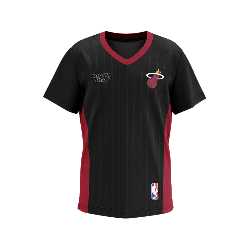 Camiseta de modelagem diferenciada com gola V, confeccionada com mix de tecidos e etiquetas termocolantes da NBA. Feita em tecido DRY RISCA, que possui leve efeito listrado, absorve e elimina o suor, garantindo melhor transpiração.