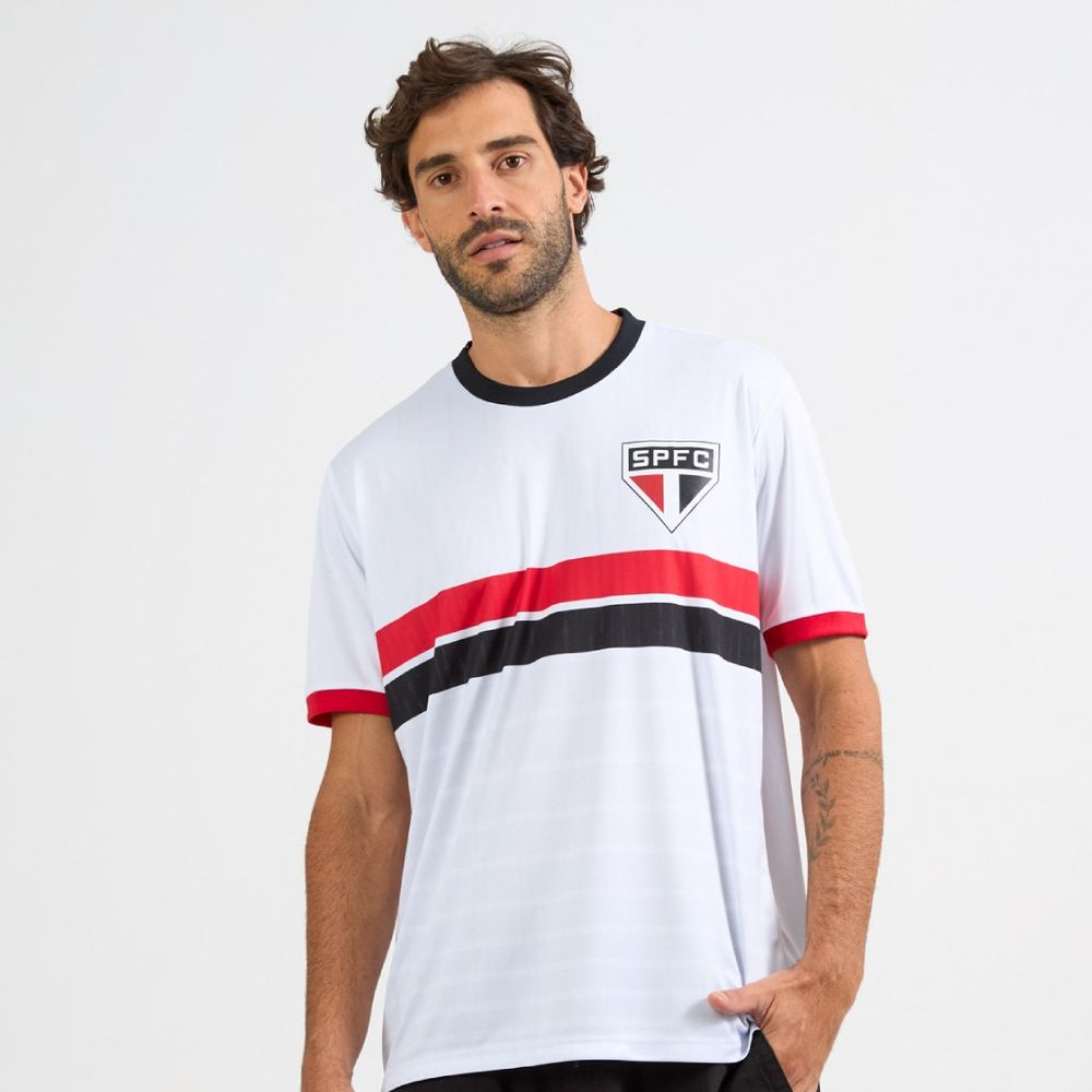 Remetendo ao colorido tricolor, a Camiseta São Paulo Tela destaca gola e punhos contrastantes e aposta na estampa de toque zero inspirada em tingimentos naturais. As listras horizontais fazem referência às primeiras décadas do clube, homenageando sua história com estilo e autenticidade.