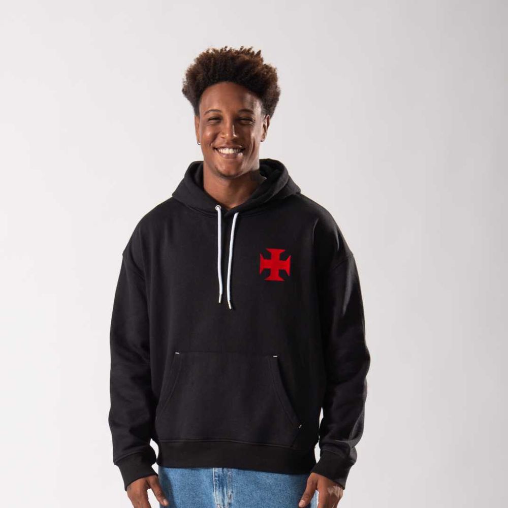 Em moletom felpado internamente, proporciona toque macio e aconchegante para os dias mais frios. Na cor preta, destaca a Cruz de Malta bordada em vermelho no peito, evidenciando a paixão e o orgulho pelo Vasco. O modelo conta com bolso canguru frontal, unindo conforto, estilo e identidade cruzmaltina em uma peça versátil para o dia a dia.