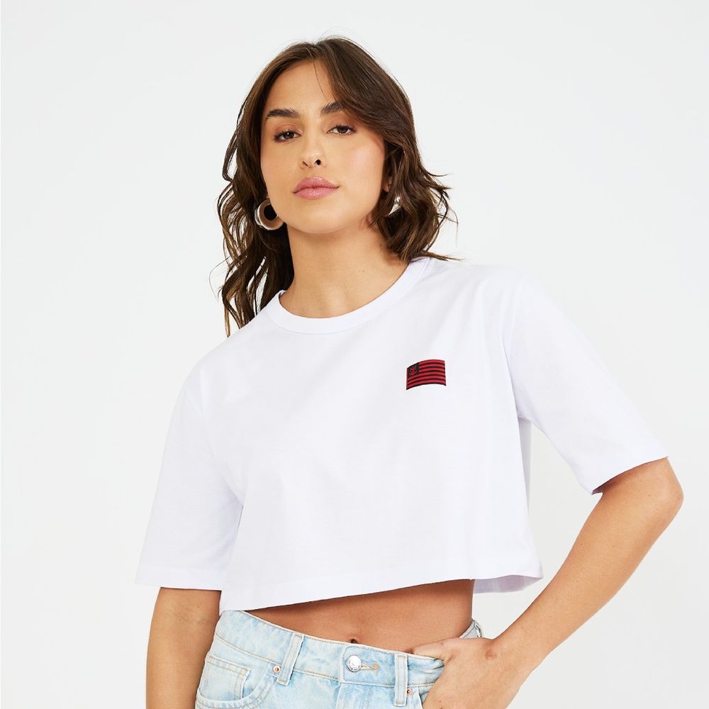 Cropped básico de apelo casual, confeccionado em Meia Malha 30.1 100% algodão, que oferece conforto, durabilidade e maciez ao vestir. O modelo traz design exclusivo, destacando-se pela etiqueta termocolante da bandeira do clube no peito e por uma estampa marcante da torcida no Maracanã com o Cristo Redentor ao fundo, simbolizando a paixão e a força da Nação Rubro-Negra.