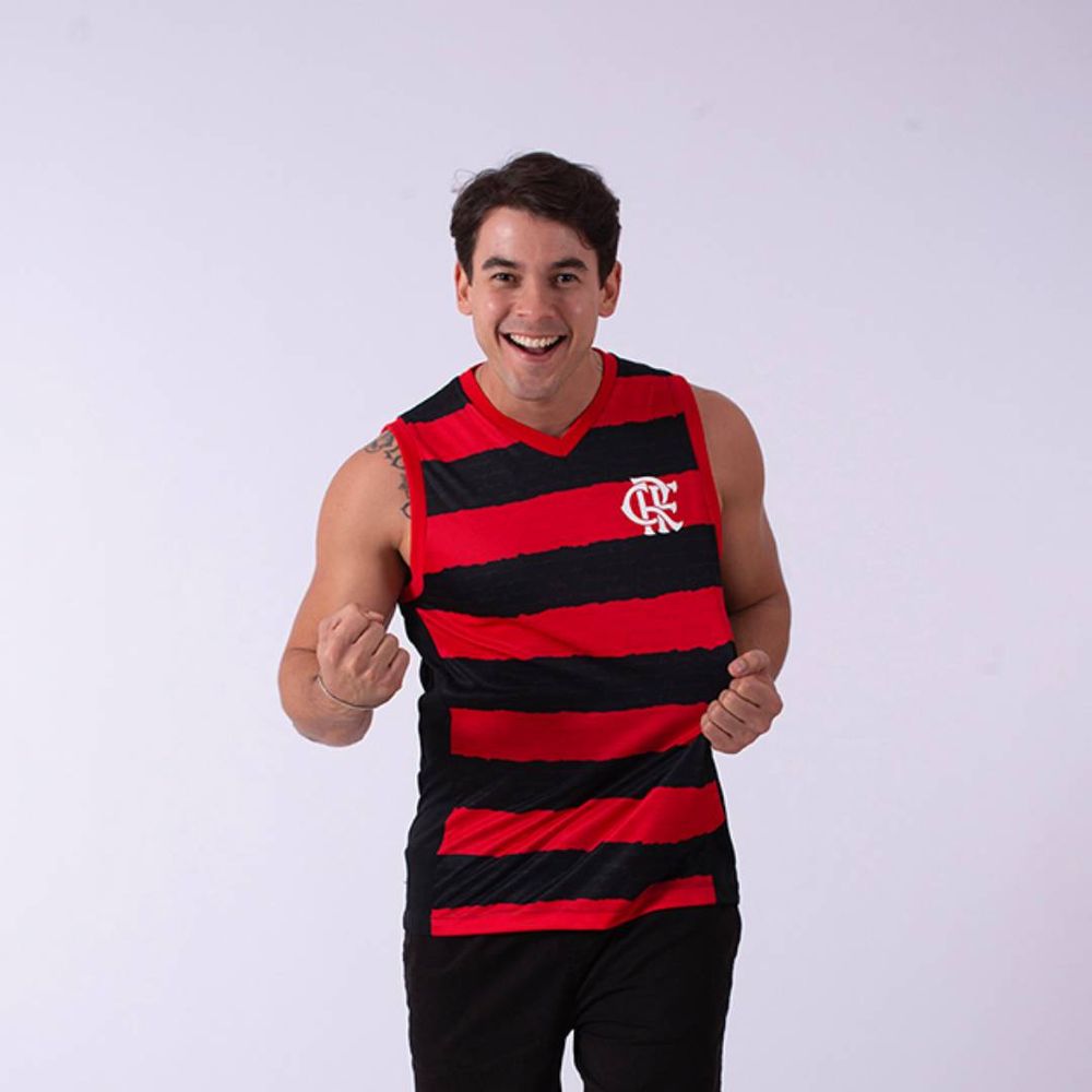 Regata com gola V e recorte nas laterais. Além disso, a peça leva estampa de toque zero das tradicionais listras rubro-negras com o hino do Flamengo escrito por Paulo Magalhães em 1919. Tecido: DRY MAX